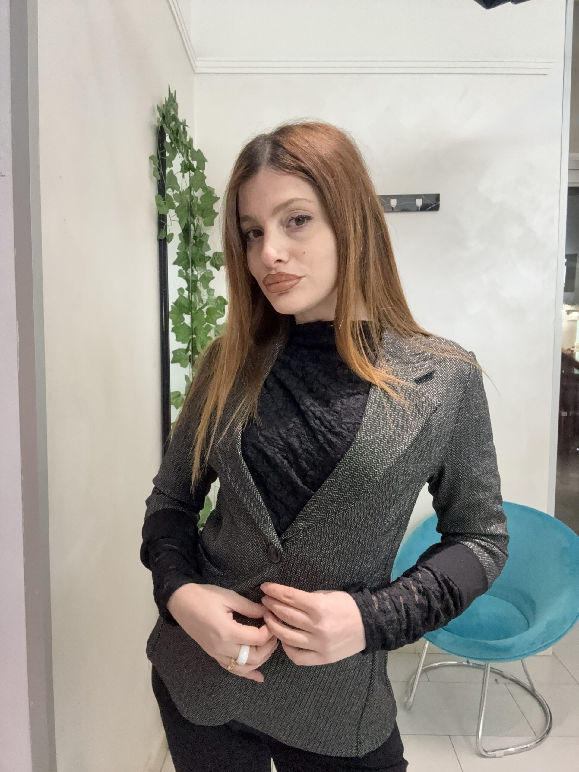 L’effetto laminato di questo blazer dona luce senza risultare eccessivo: elegante di giorno, magnetico di sera.