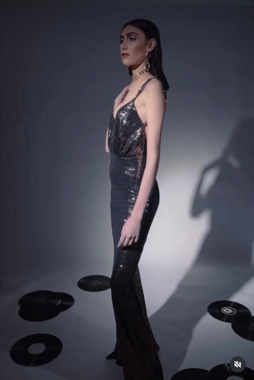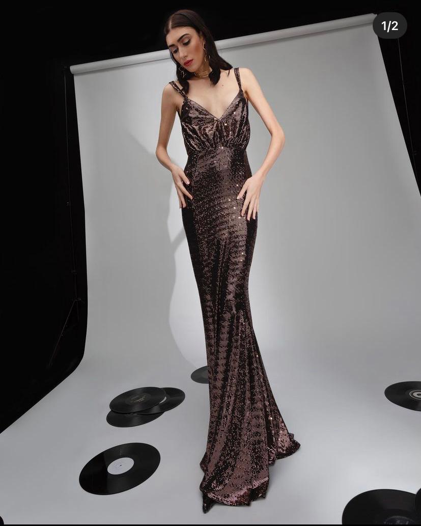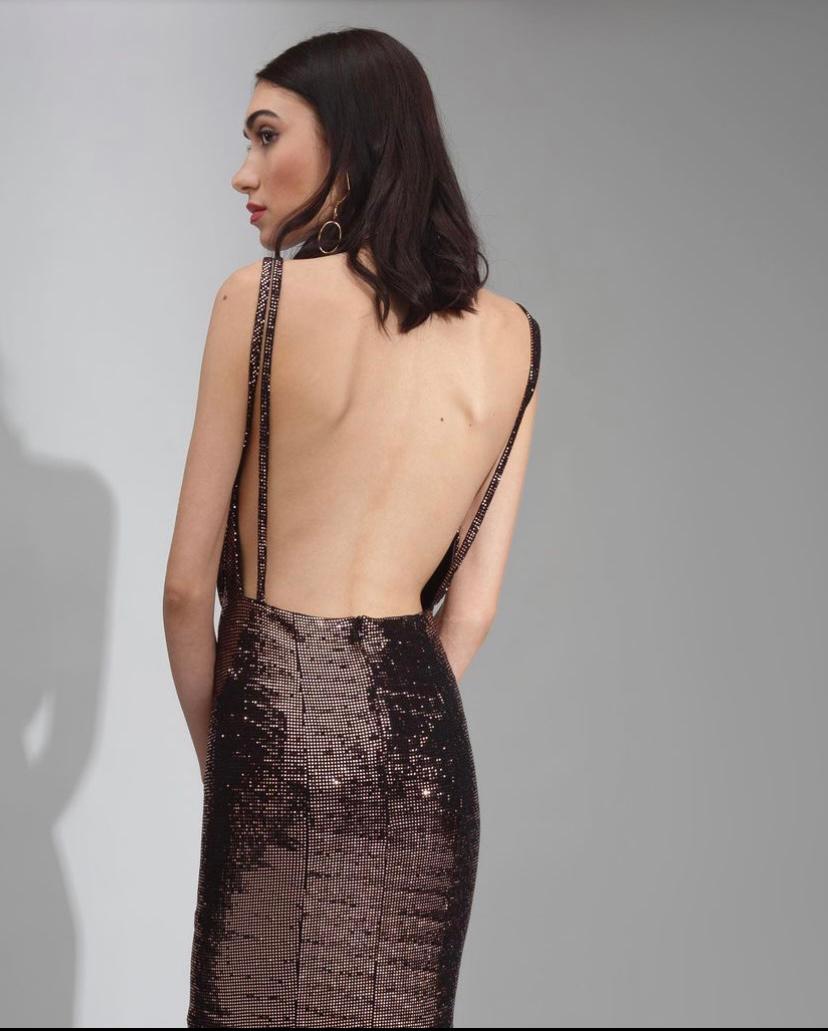 Abito laminato color bronzo, con doppia spallina e schiena scoperta. L’abito è dotato di zip a scomparsa