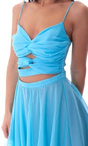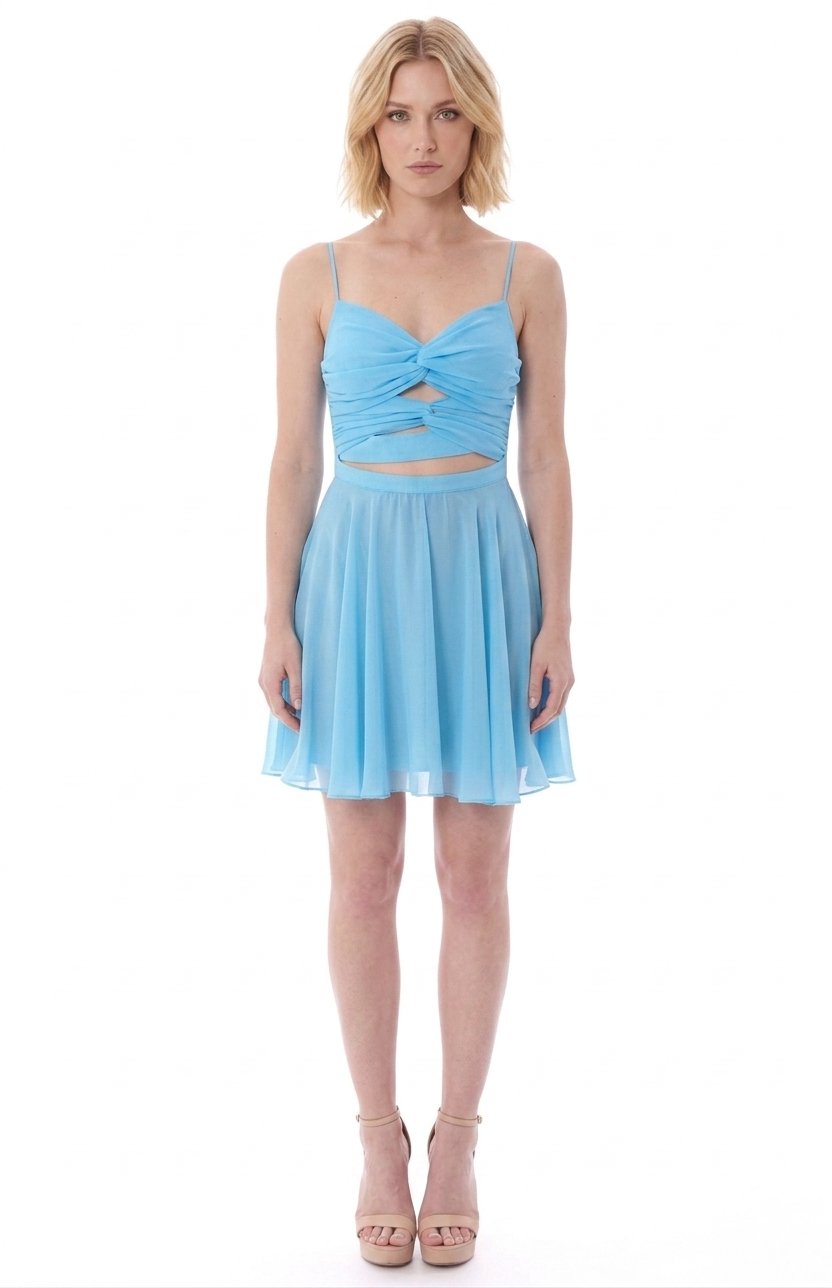 Il design corto con volant morbidi crea movimento ad ogni passo, mentre i cut-out strategici valorizzano la silhouette con eleganza, senza risultare mai eccessivi. Il colore azzurro illumina l’incarnato ed è perfetto per eventi di stagione, cerimonie o serate in cui vuoi essere ricordata.