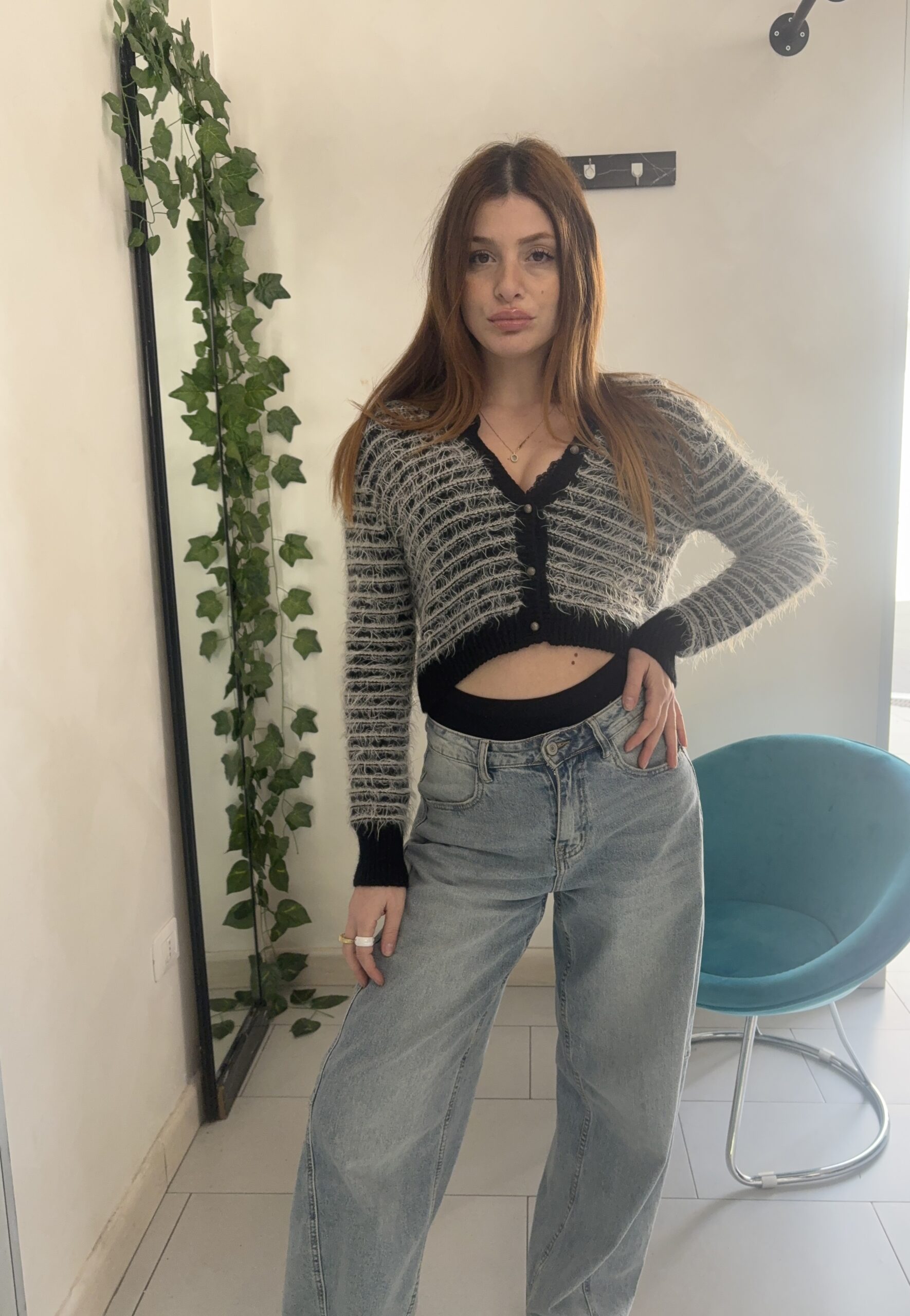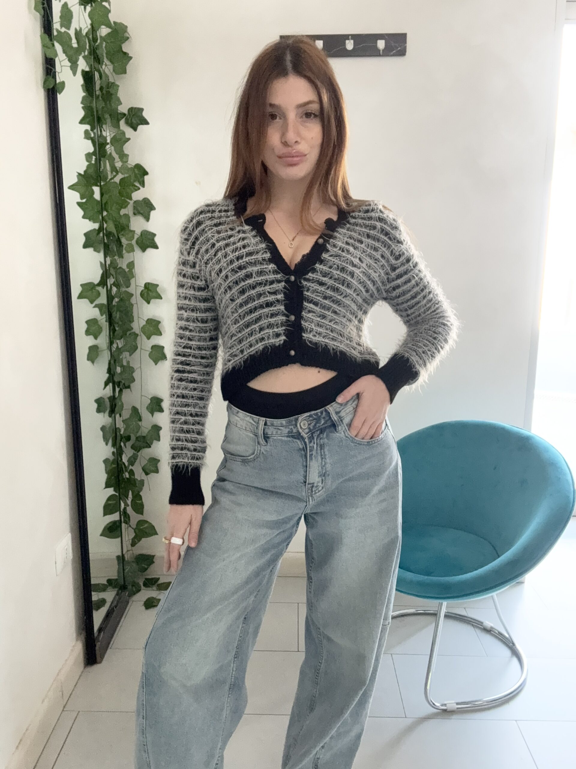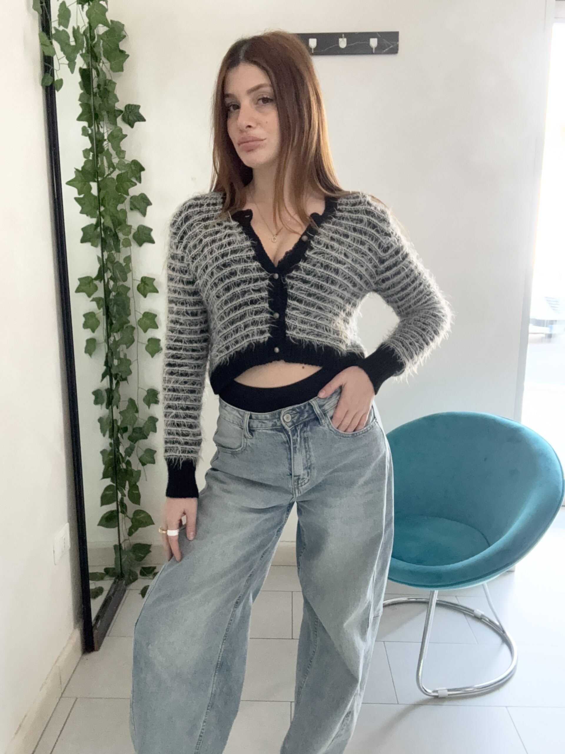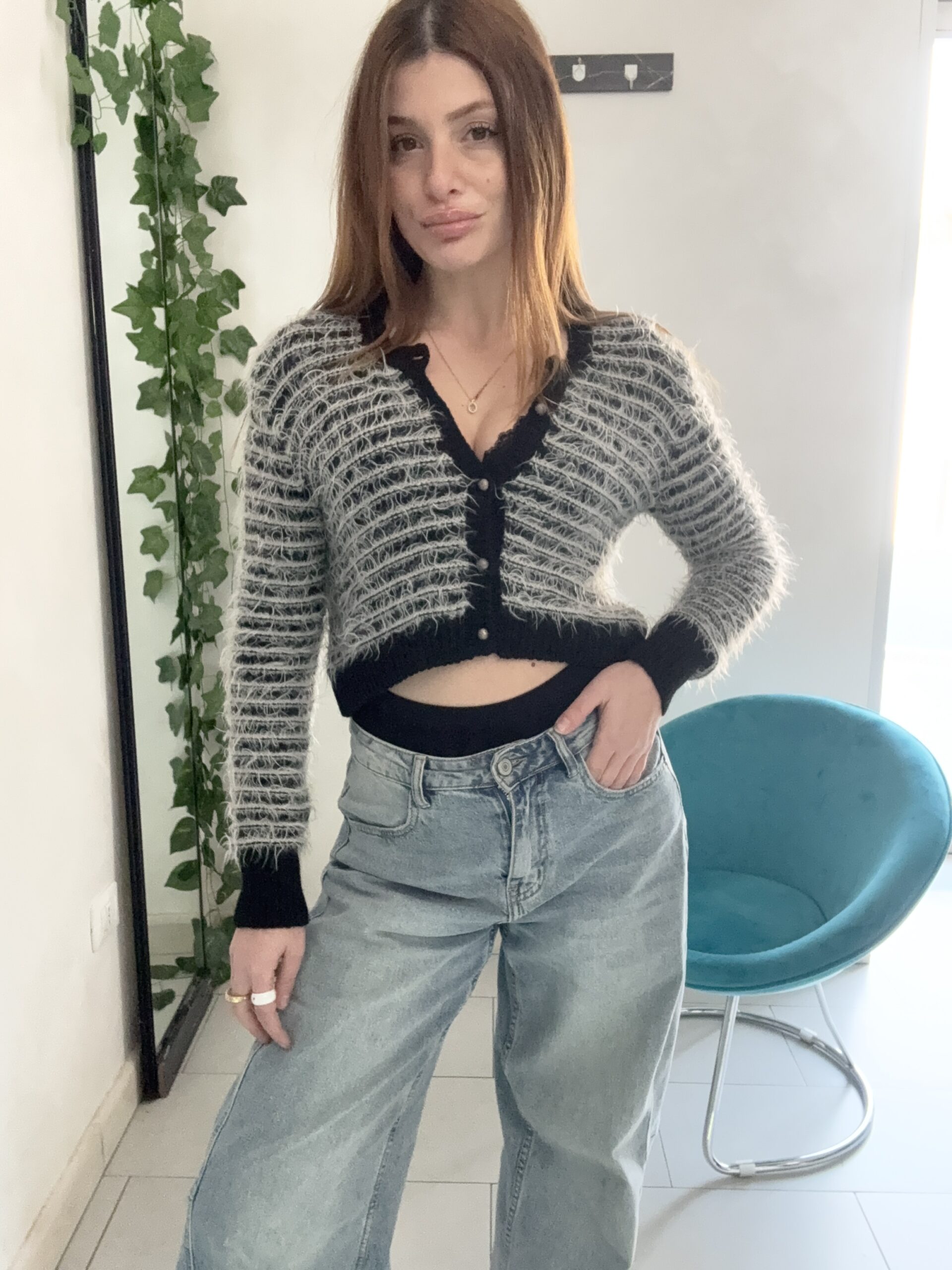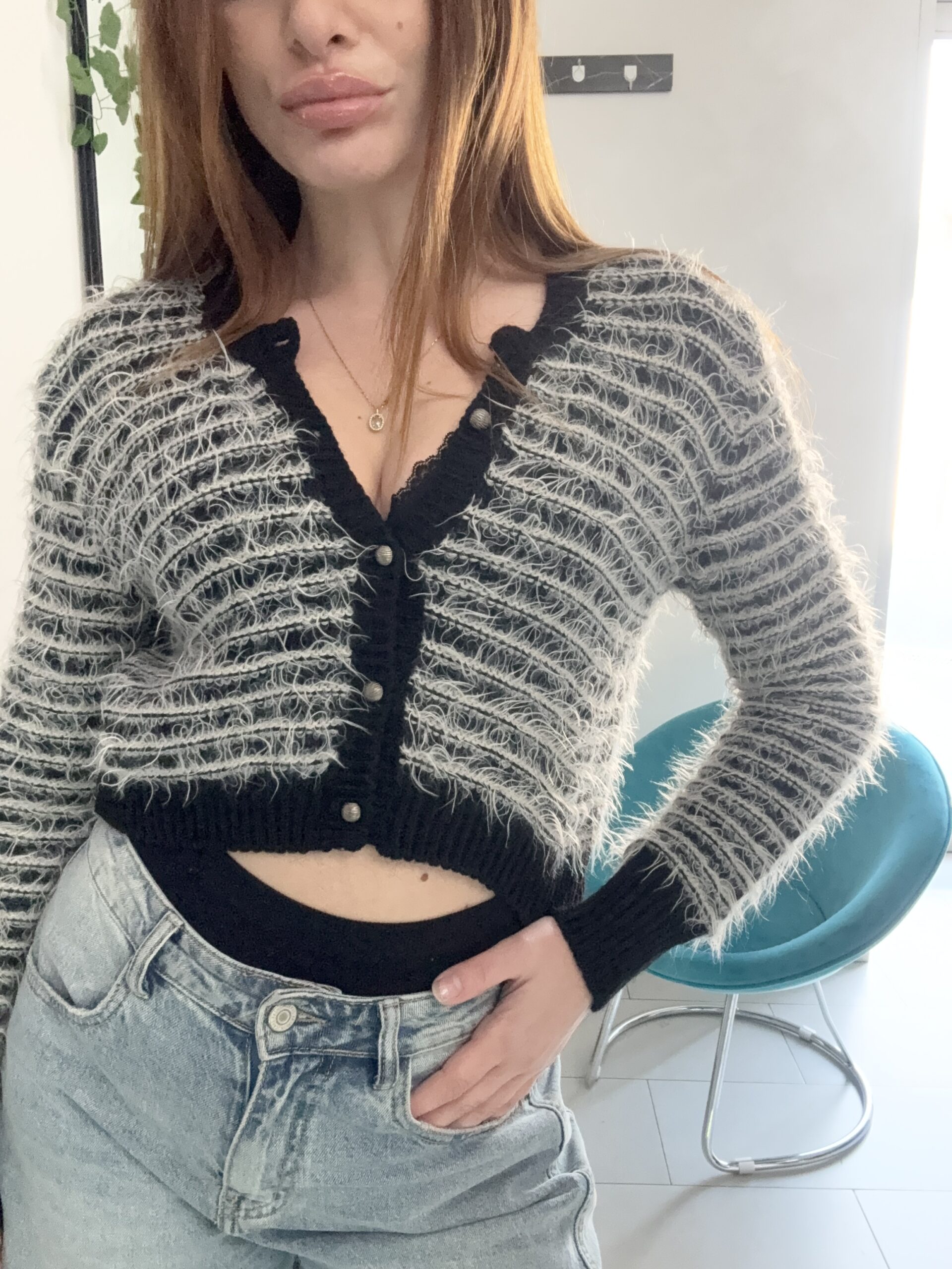 Cardigan con texture fluffy effetto peluche con lavorazione a righe in rilievo, profili neri a contrasto e bottoni gioiello che danno carattere.