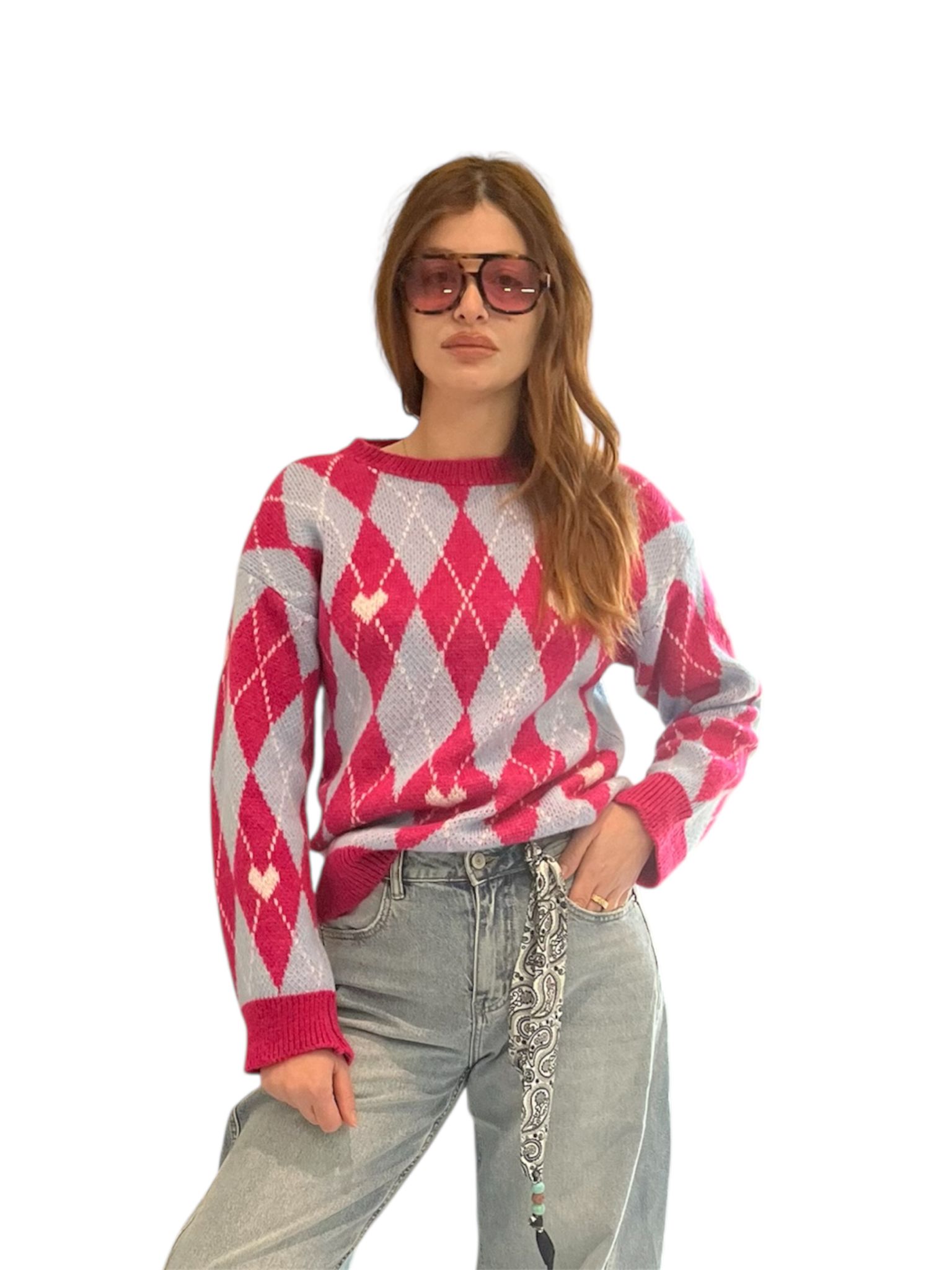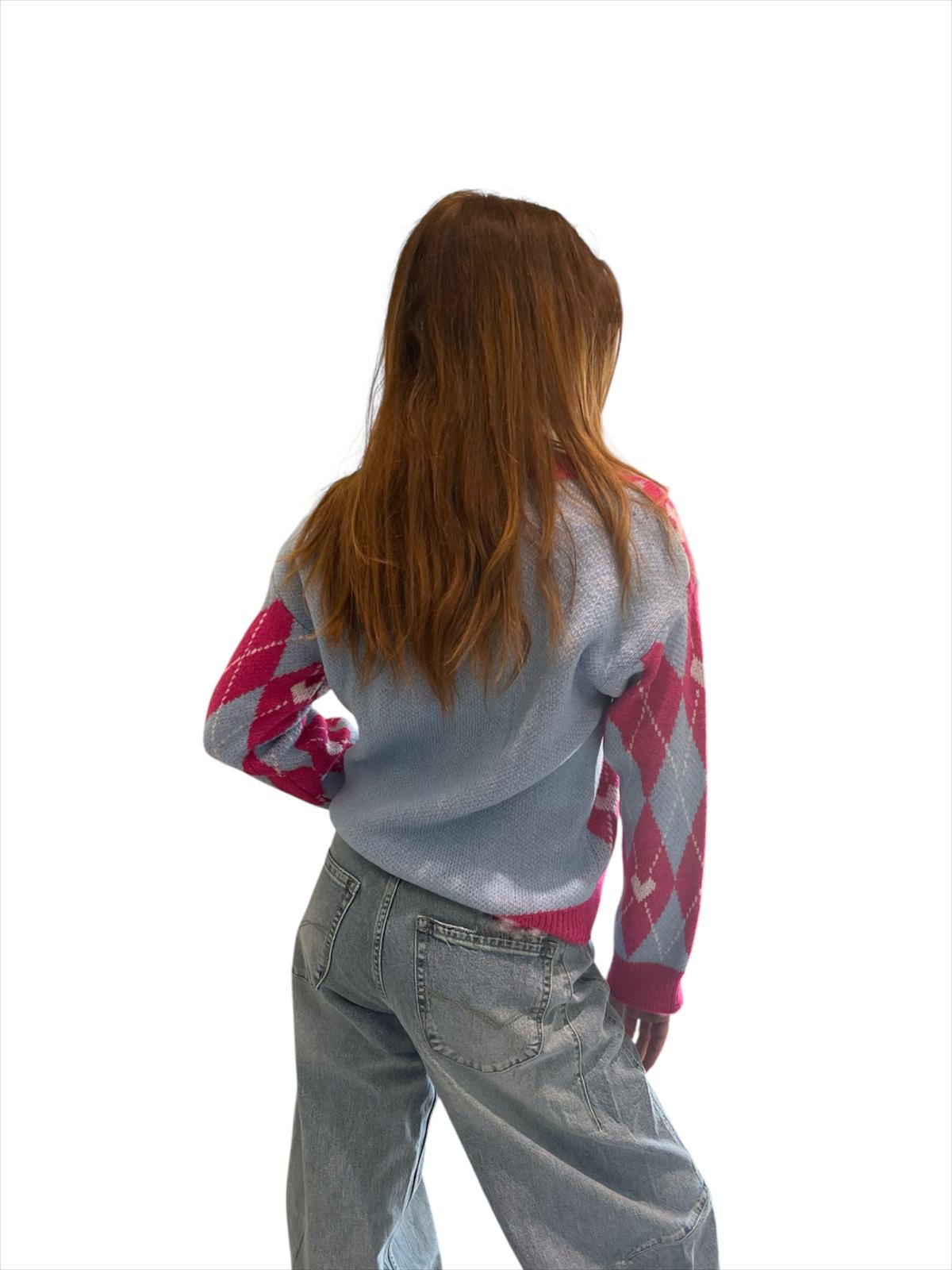 Il maglione a rombi con cuori, è uno di quei capi che funzionano sempre e che rendono i tuoi outfit meno noiosi.