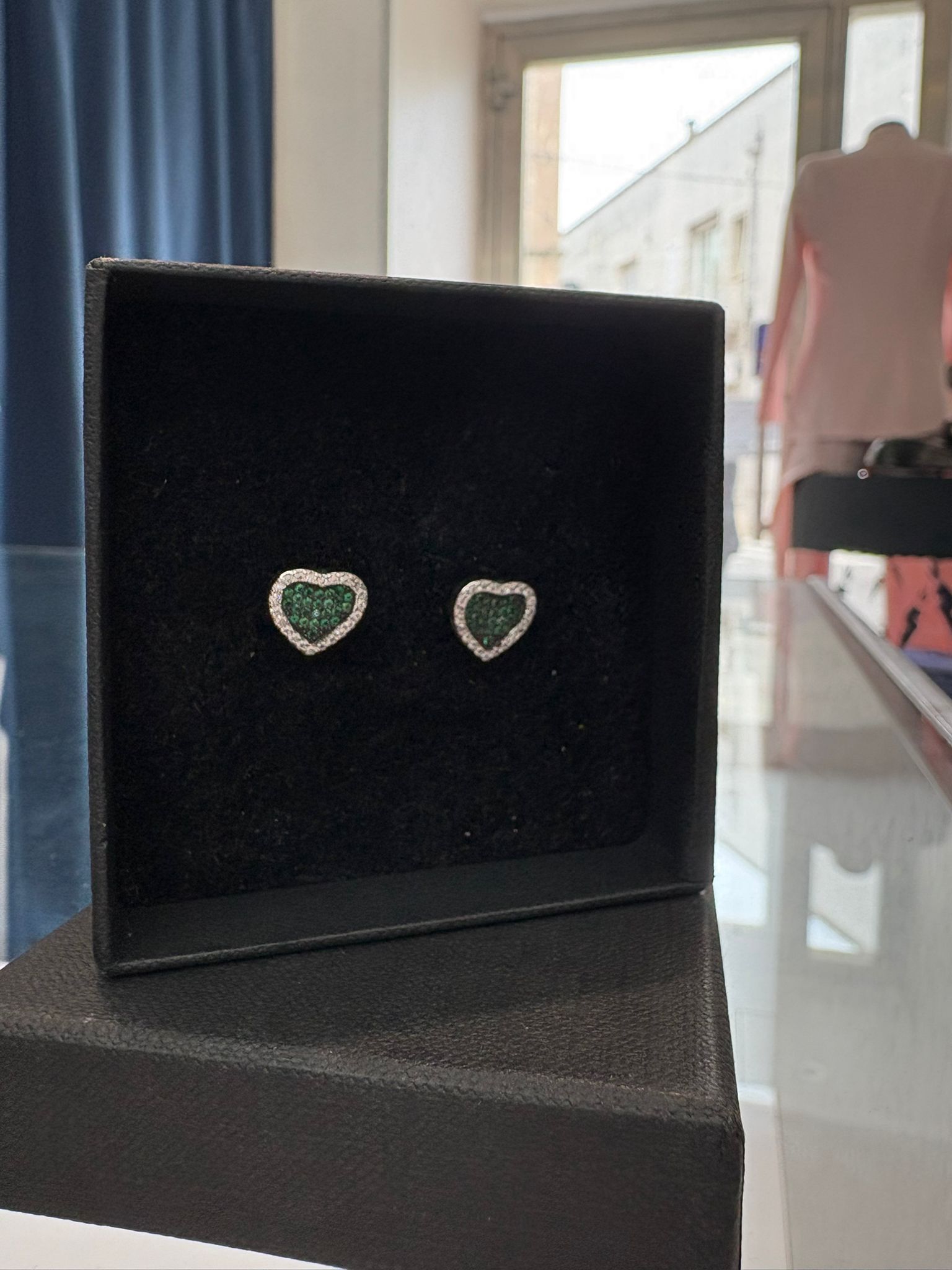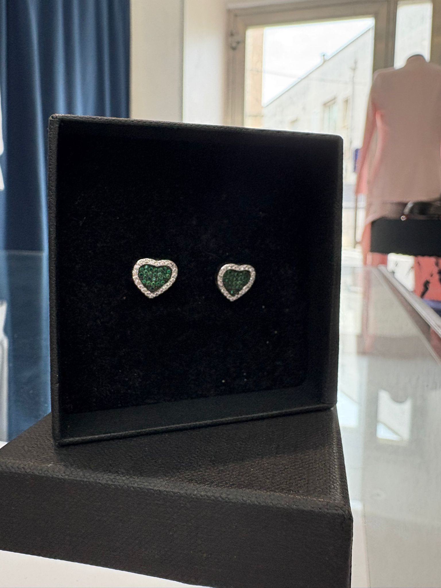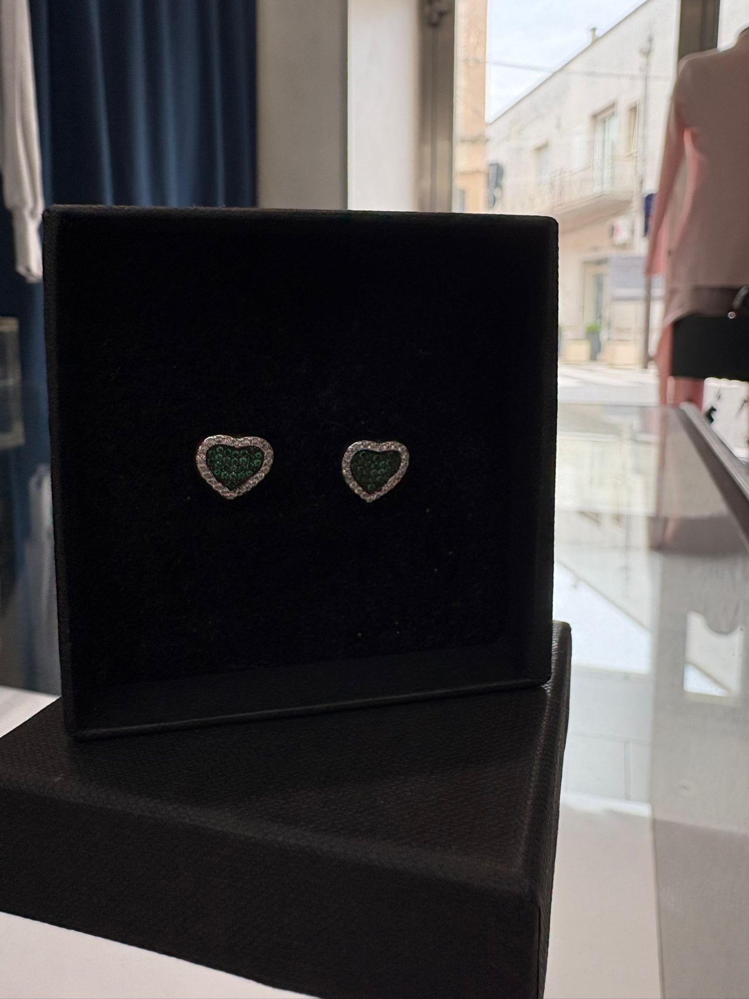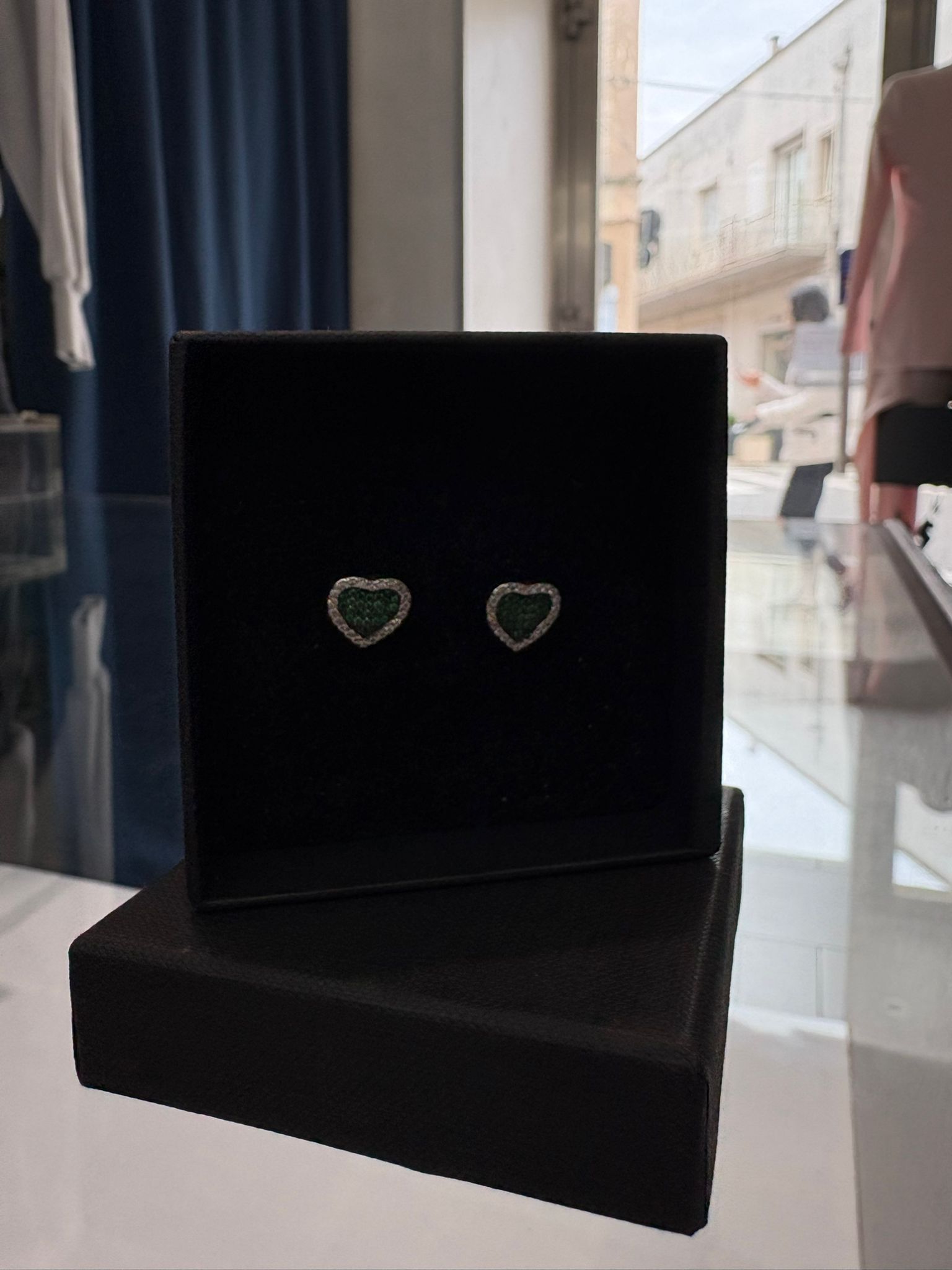 Realizzati in argento 925, questi orecchini a lobo reinterpretano un simbolo classico in chiave contemporanea. Il contorno luminoso esalta la forma, mentre il cuore interno verde cattura lo sguardo e lo trattiene.