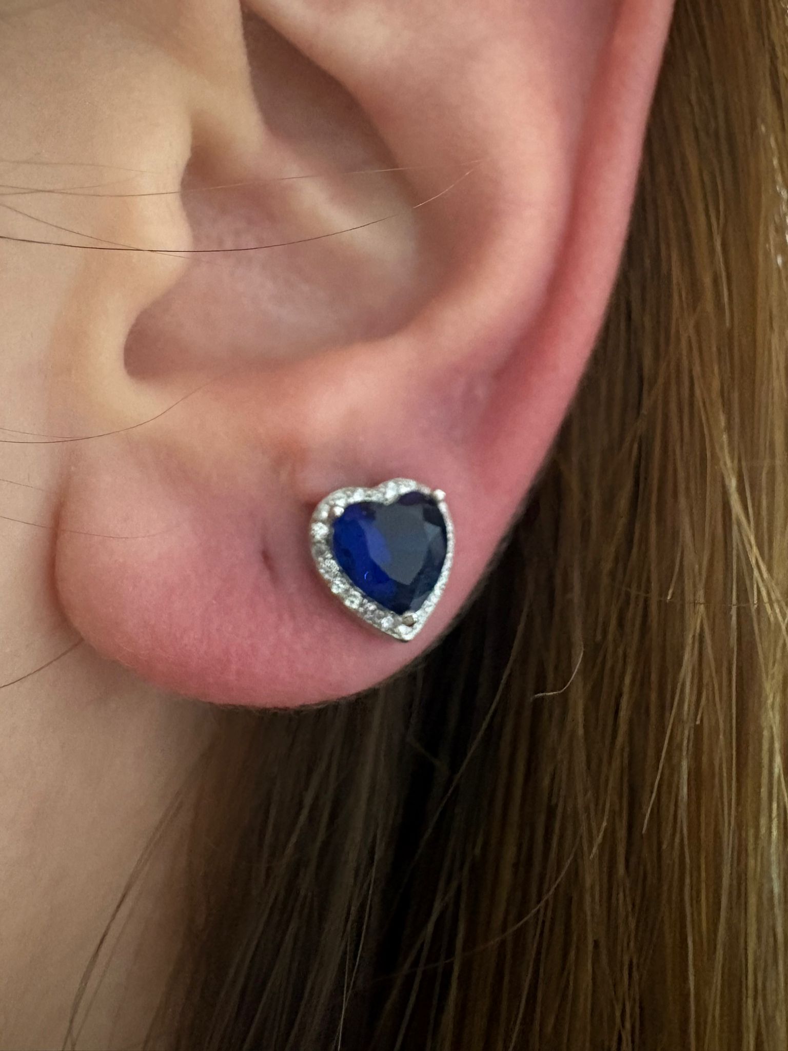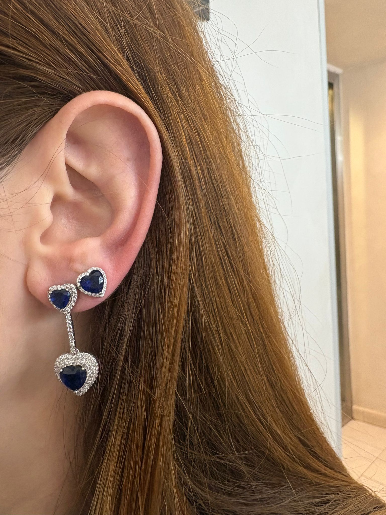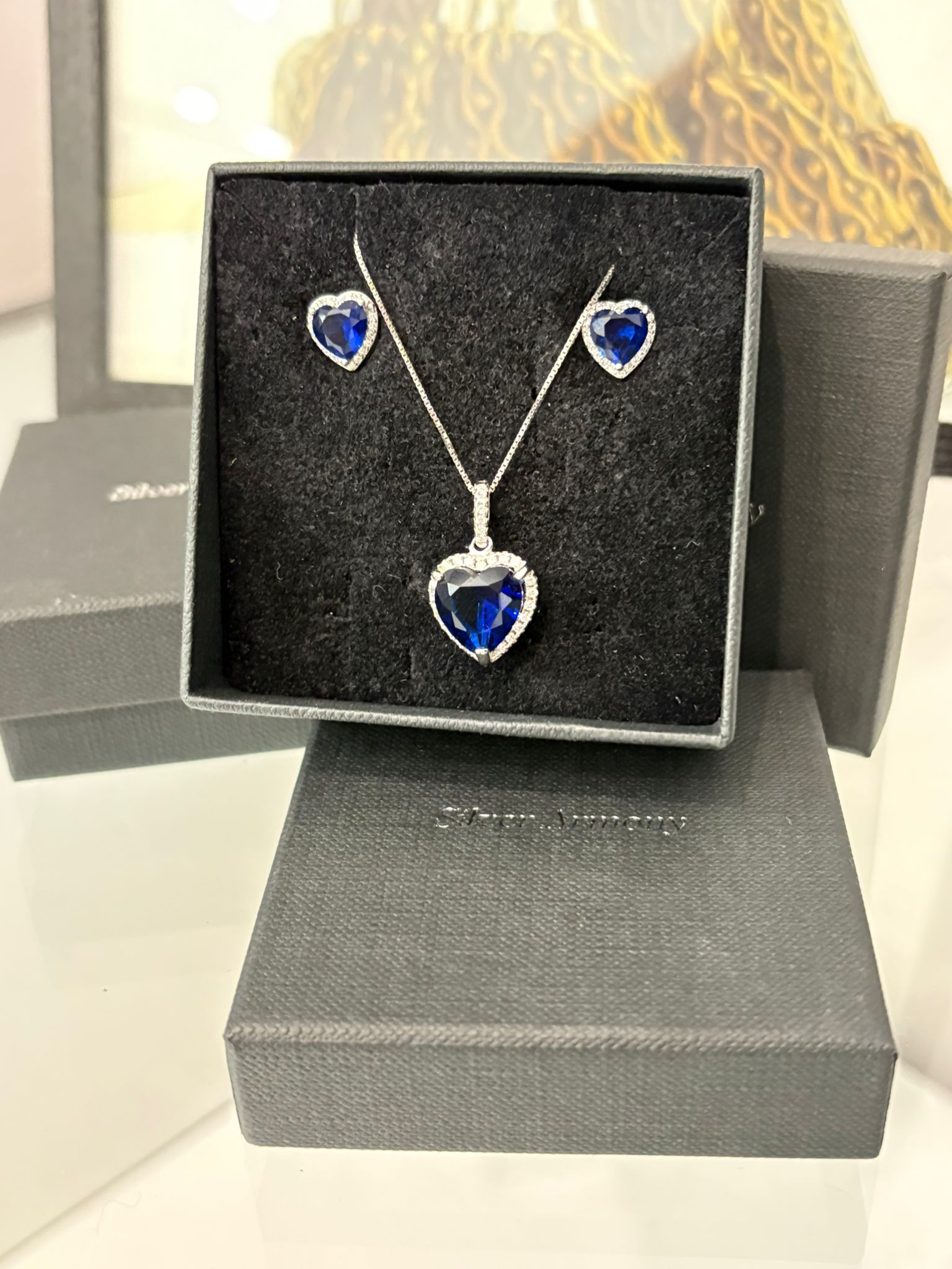 Il set crea continuità visiva tra viso e décolleté grazie al design coordinato, mantenendo un’estetica pulita e moderna. Gli orecchini a lobo con cuore blu incorniciato da zirconi donano luce al viso, mentre la collana completa il look con eleganza equilibrata e portabilità quotidiana.