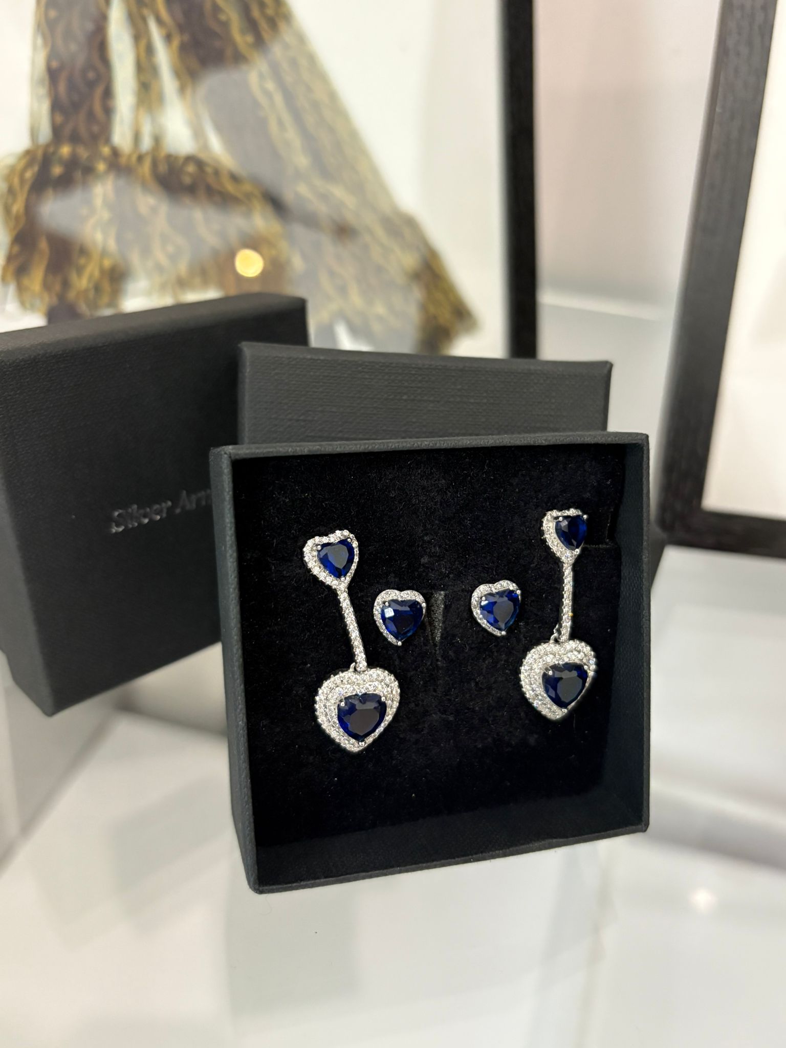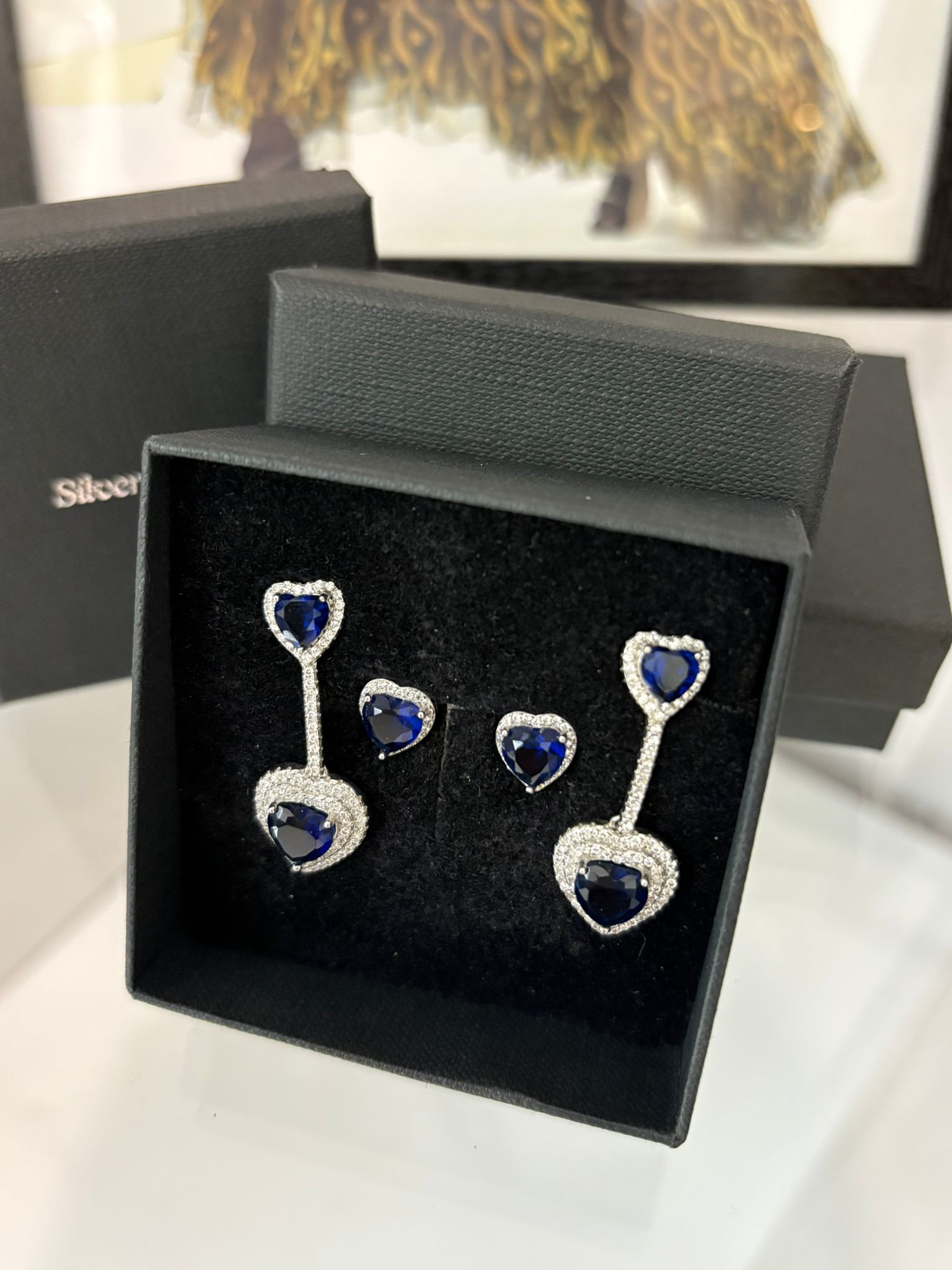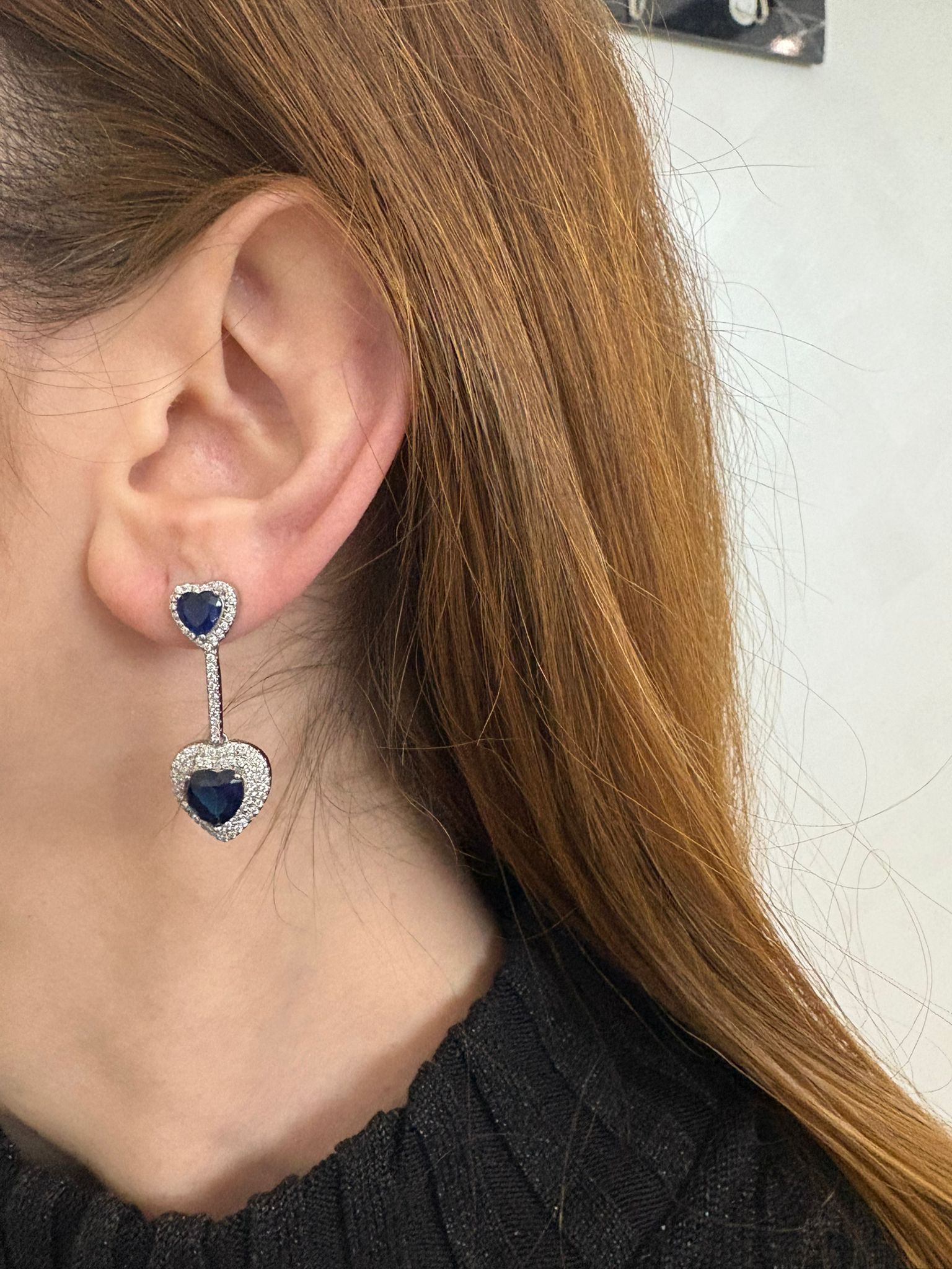 Il secondo paio è composto da orecchini pendenti coordinati, con cuore blu sia al lobo sia nella parte pendente, creando movimento e maggiore presenza visiva mantenendo eleganza e proporzione.