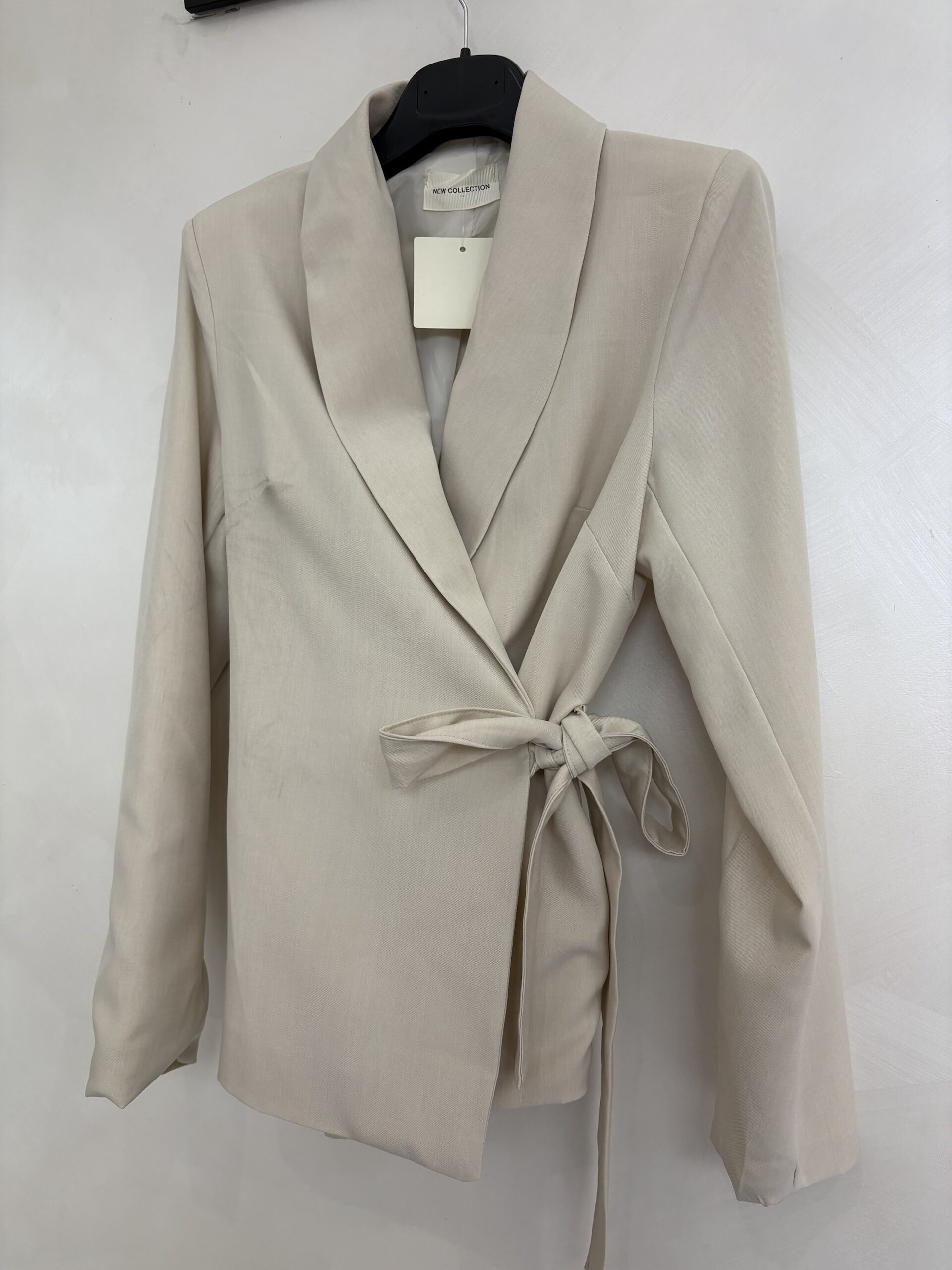 La giacca è costruita con linea morbida e rever sciallato, chiusura asimmetrica con lacci laterali e fiocco regolabile: un dettaglio stilistico che ridefinisce il punto vita e crea movimento.