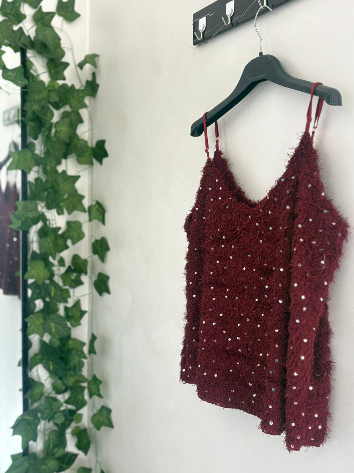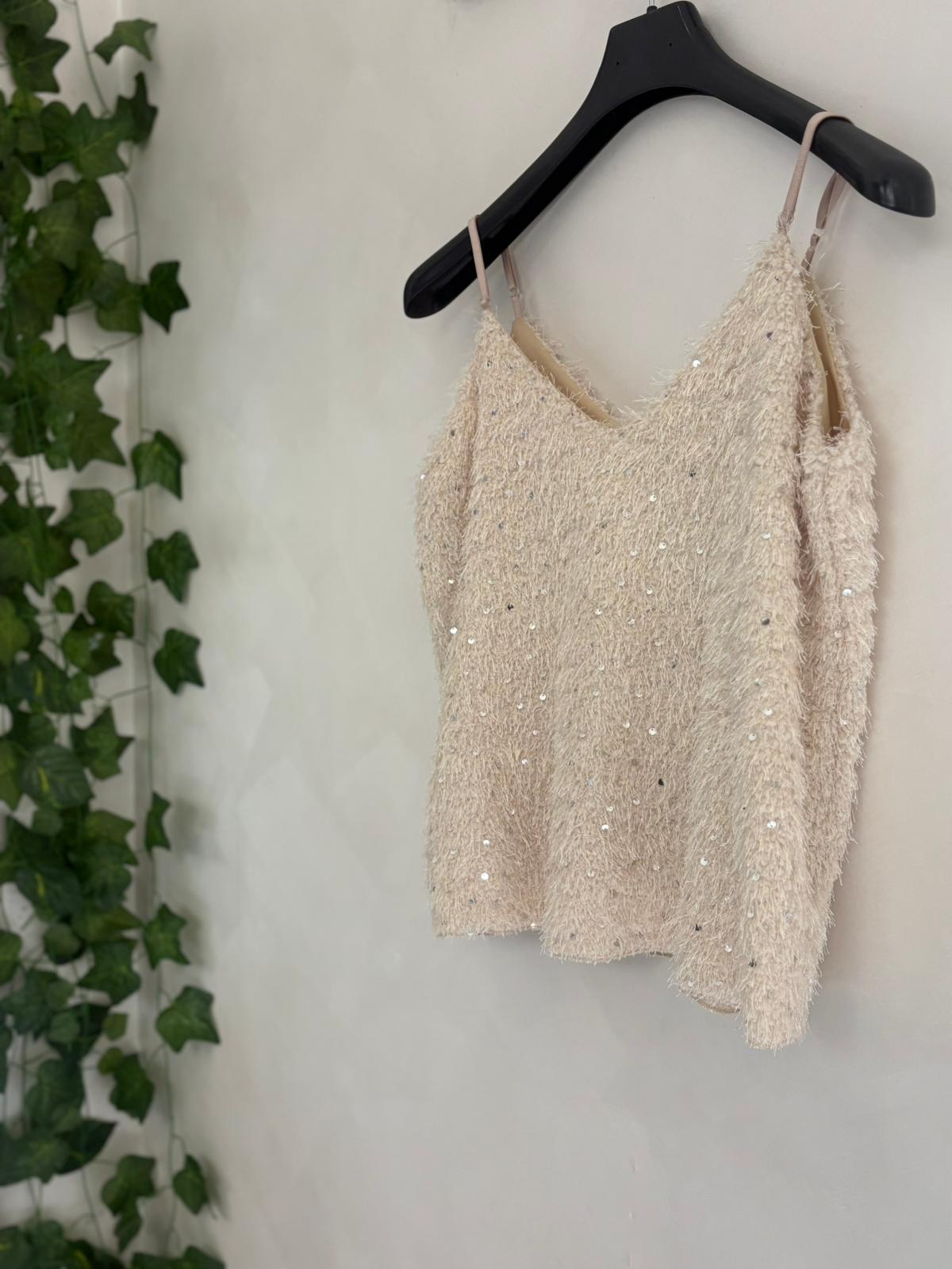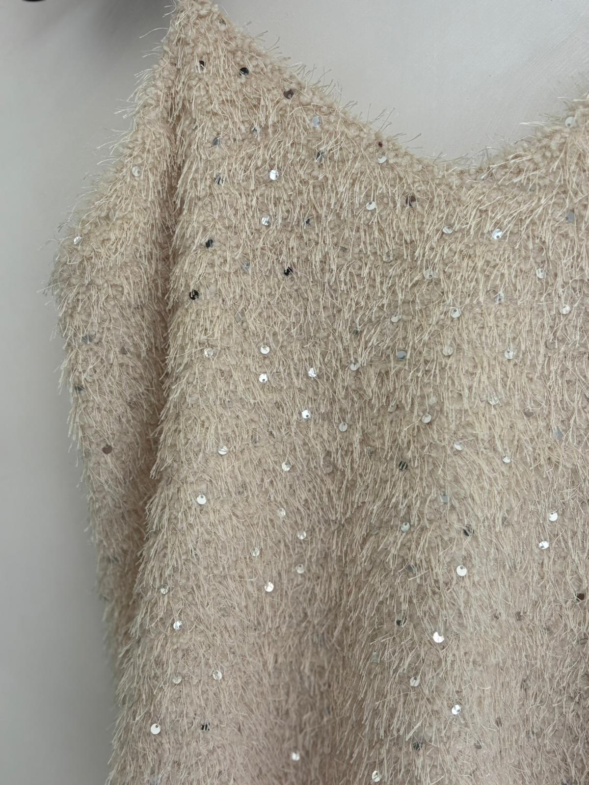Il tessuto fluffy avvolge e scalda senza appesantire, mentre le micro paillettes incastonato tra le microfrange catturano la luce quel tanto che basta per farsi notare con eleganza, ma senza eccesso.